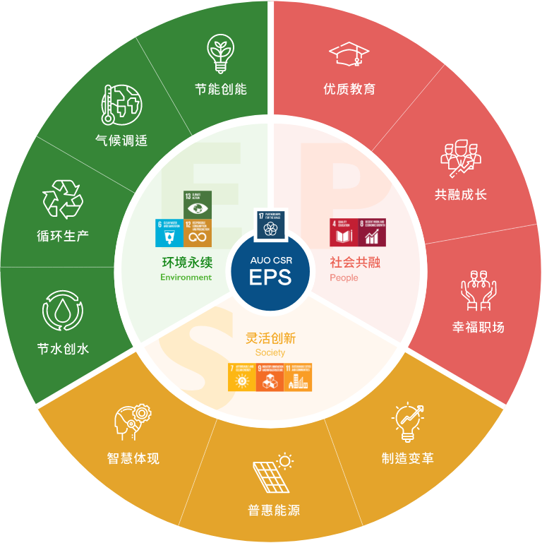 根据联合国所发展的17项永续发展目标,ks凯时光电以「超越企业社会责任,创造共享价值」为企业永续愿景发展蓝图,订出环境永续、共融成长与灵活创新的EPS(Environment, People & Society)三大永续发展主轴;以响应日益受关切的环境议题与社会共融趋势。
